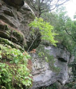 Climbing on wet rock can be tricky and very dangerous, so it was deemed preferable a clean opening through the bluff be found through which to initiate a climb. Off, then, along the base of the bluff I trudged in hopes of finding such a gap, and it was as I rounded a sharp protuberance of rock that something not but maybe 100 meters beyond caught my eye. The woods can play tricks on one’s vision, and having firsthand experience of that, I stood for a bit and swayed from side to side in an effort to determine if what I thought I was seeing was truly for real. That little exercise in reality testing helped me derive the conclusion that, indeed, I was looking at a rock wall reminiscent of those that distinguished each of the three previously visited falls. Cuffing a hand behind each of my ears and listening intently for the sound of falling water confirmed what I hoped it would. Yes, we had found it.