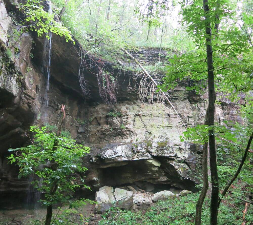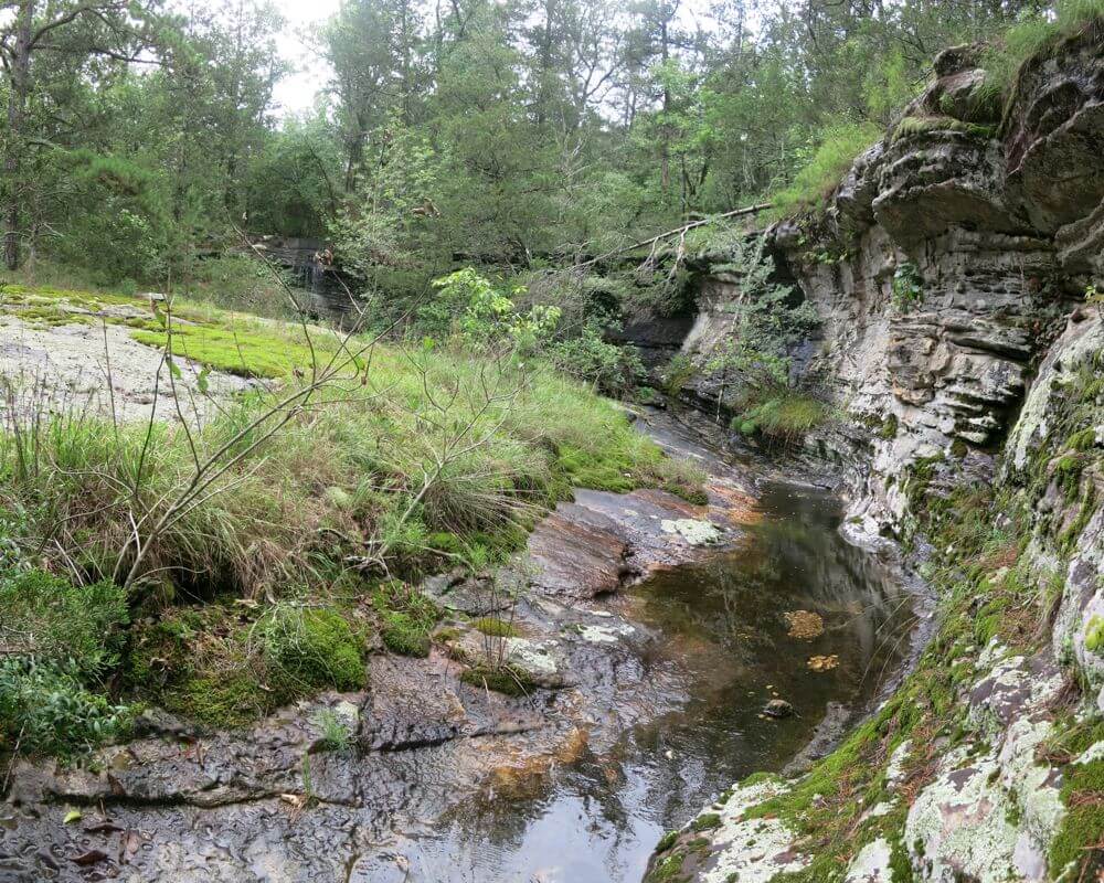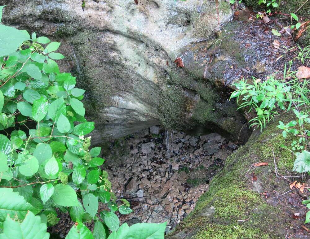 Fortunately, I did come prepared with the waterproof map of the east half of the Buffalo National River in hand. But, given the falls are not noted on it, we still had no way of knowing for sure whether the trail we intersected would take us to another waterfall. What we predicted with reasonable certainty was that heading back up the trail and on past the intersection we had encountered just minutes earlier would lead us, at the very least, to South Prong. Off again we went with a growing sense of determination to find an answer to the question that had spawned our undertaking. In no time at all we hit the point where the two trails linked and pushed forward moving downhill. By that time, stretches of the trail had turned into mini-creeks, of sorts, and given the steepness we encountered now and then, watching every step had become all-important. We were both focused; I was in the lead. No one wanted to slip and risk injury, and the thought of stopping to observe the surroundings had all but vanished from my mind. Somehow, though, the thought occurred that it was important not to watch just where I stepped but to pay attention to the area through which we were navigating. Up went my line of vision, and to my surprise, I spotted what appeared to be a rock ledge with a hole worn through it. I could barely believe my eyes! I stood and stared for a moment and then shouted to Tom our success—we had found Little Glory Hole! Of course, had I never laid eyes on Glory Hole Falls down in Newton County, I might have never reasoned our reality. But I had, and the two, from on top at least, share a distinguishing feature—a hole through which a waterfall originates.