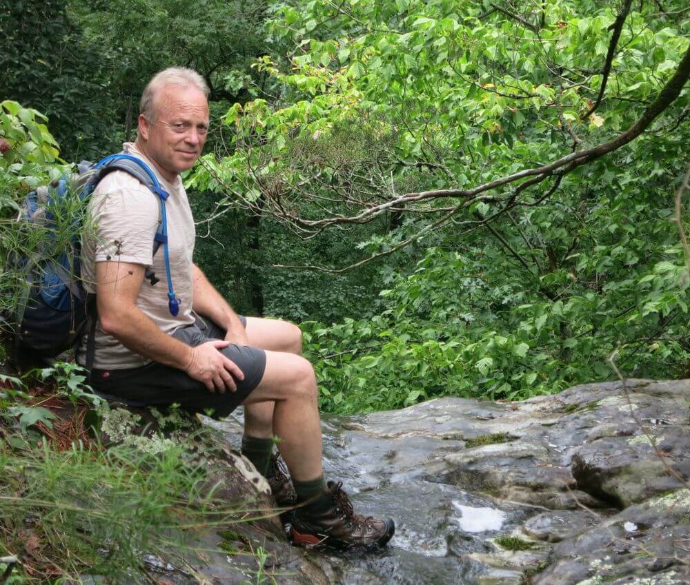 From Glory Hole on north, the trail drops downhill precipitously to South Prong. Downward we continued through a forest thick with vegetation stunningly beautiful all along the way. At South Prong, we headed west on a trail that runs the entirety of that creek to the Buffalo. Of course, we weren’t headed for the Buffalo, just Crosscut. Cruising in the direction of the final falls, we kept our eyes peeled for anything resembling a trail—there was nothing. However, using the map as our navigation tool, we eventually found what we presumed was the confluence of the intermittent stream coming off Cougar and South Prong.